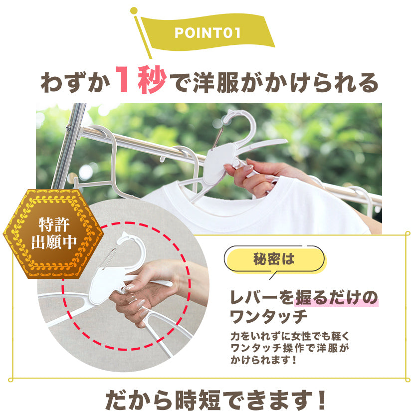 ②1秒で洋服がかけられるワンタッチレバー